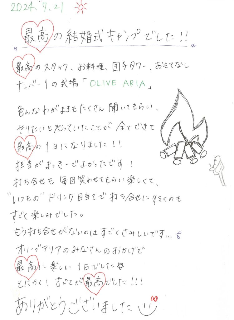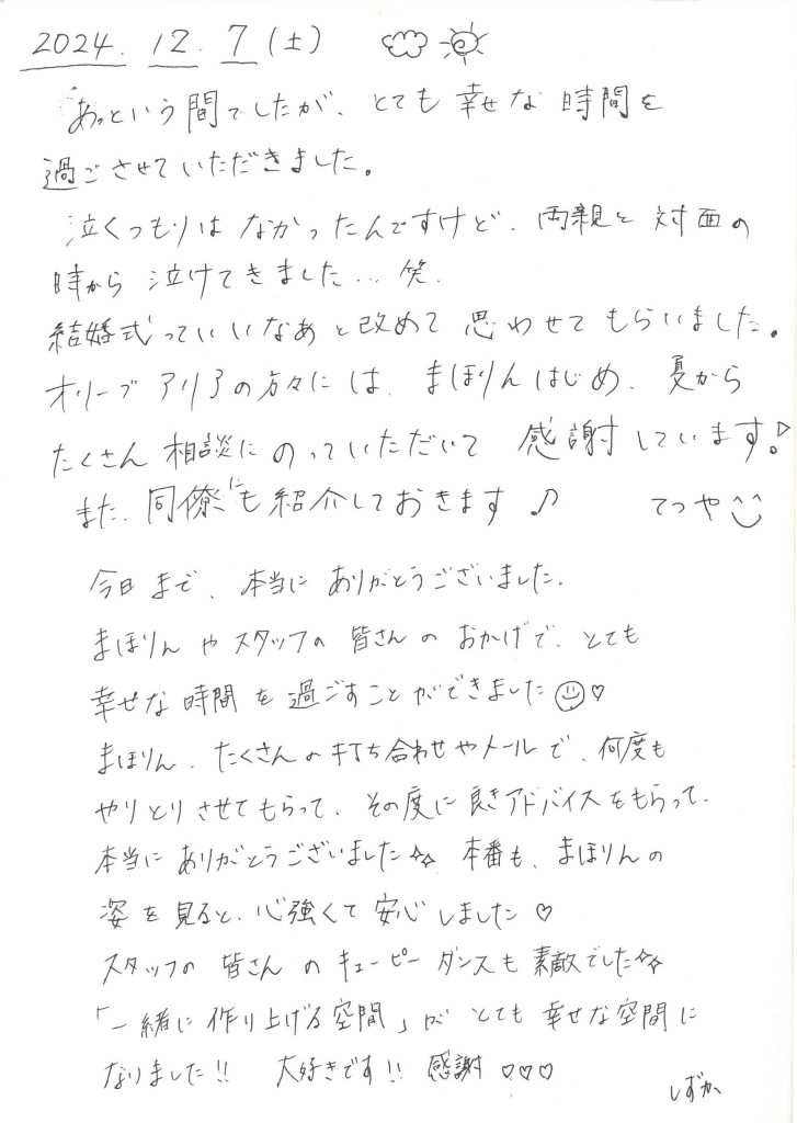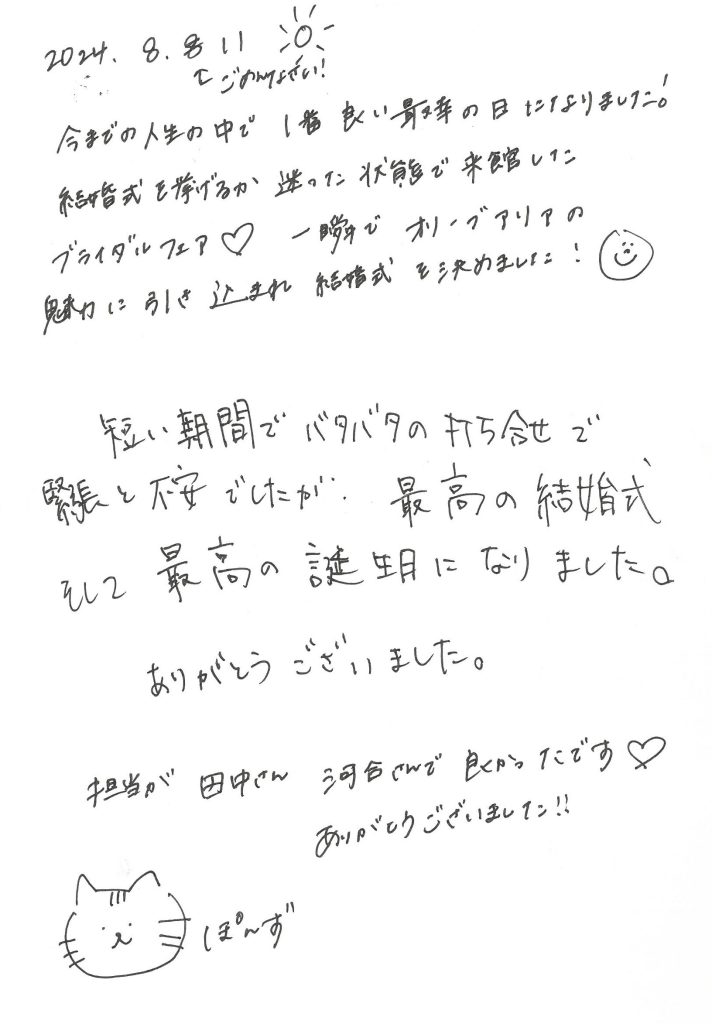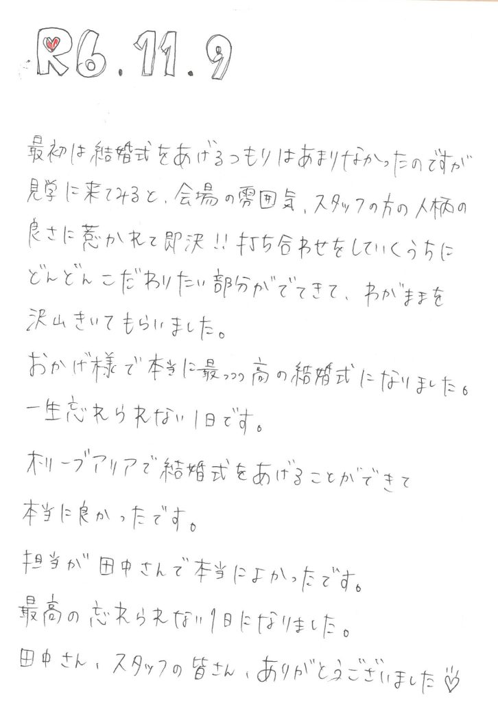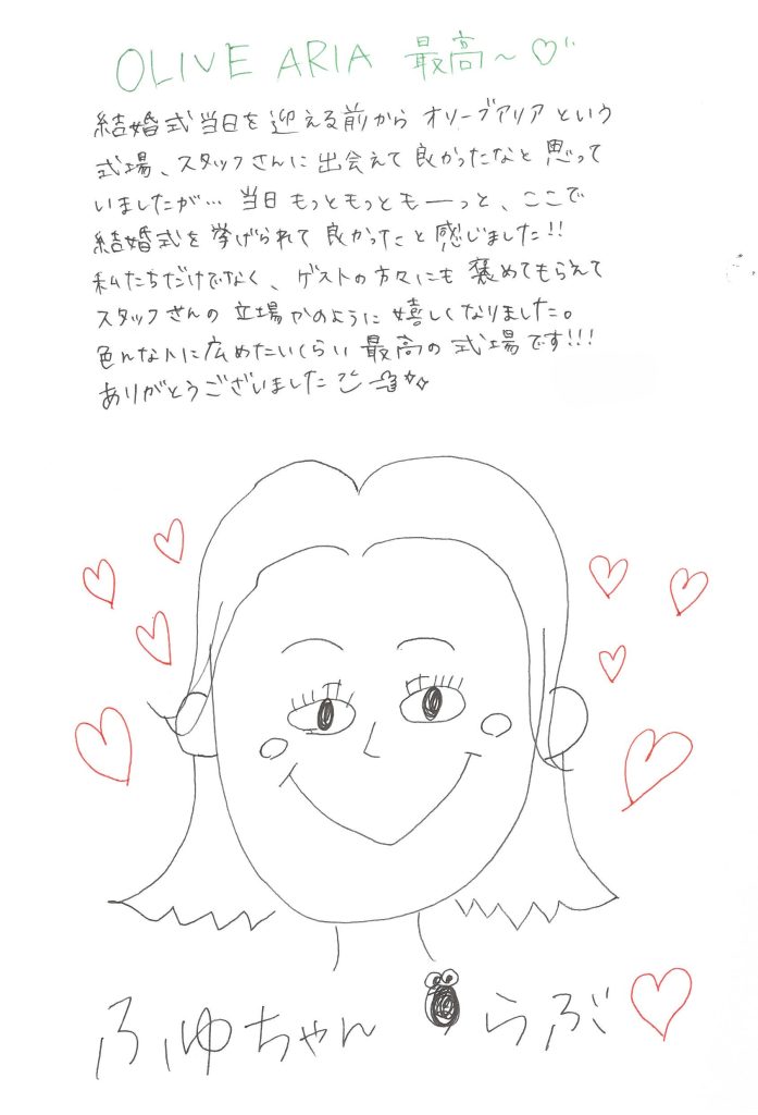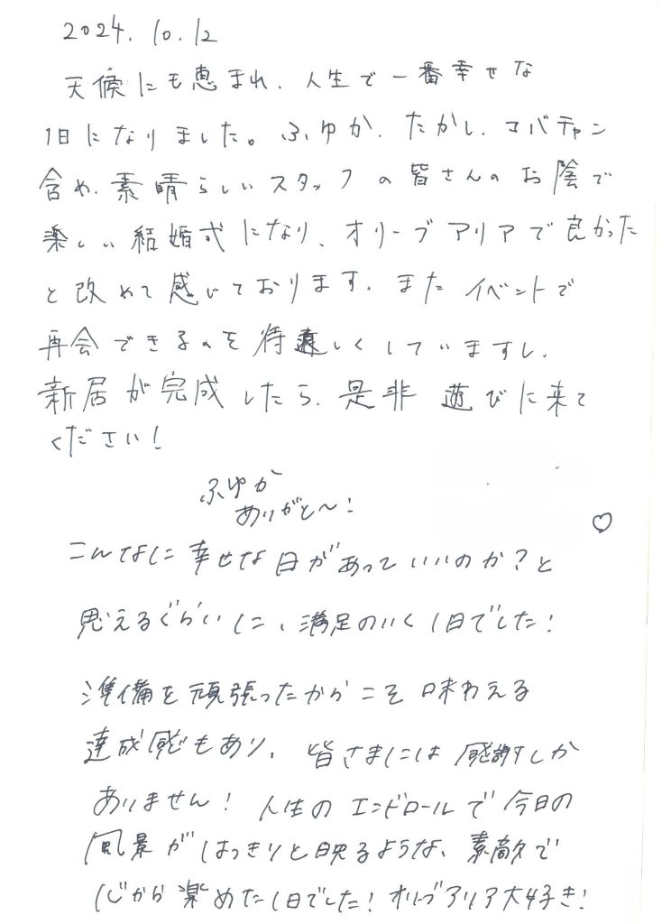 ここでは、オリーブアリアで結婚式を挙げた新郎新婦が、実際に結婚式当日に書いてくださったメッセージの一部をご紹介します。
