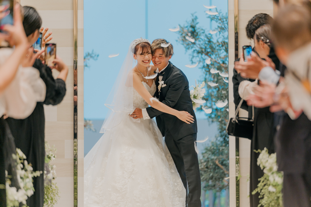 羽が舞い降り、挙式の退場シーンをやさしく演出する感動的なひととき。