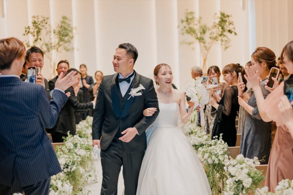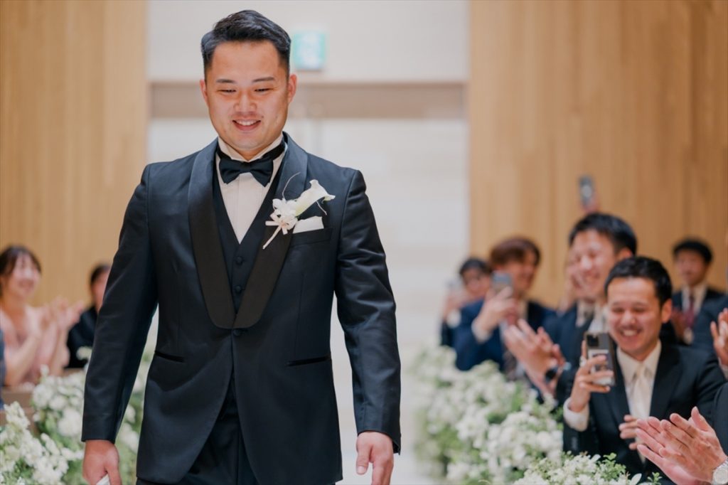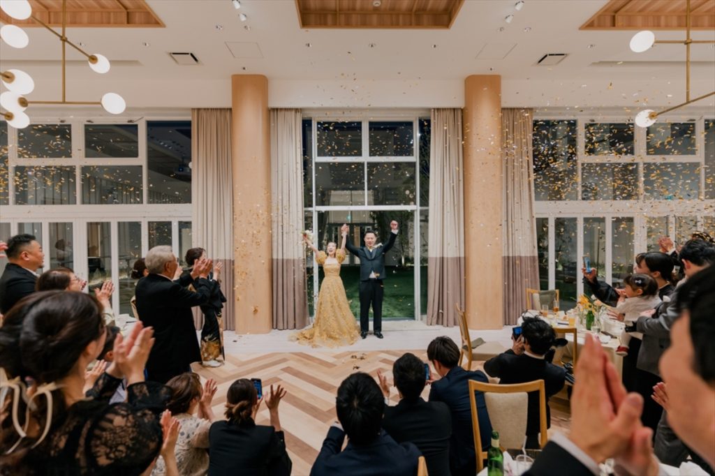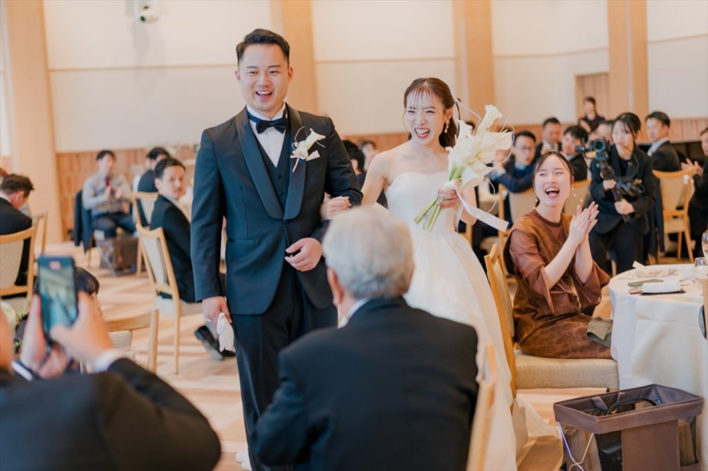 リメイク入場は、ジェットスモークを焚いてゲストの皆さまにドレスを楽しみにお待ちいただきます!おふたり仲良くご登場すると、とてもお似合いなお姿にゲストの皆さまからも歓声が上がりました♪