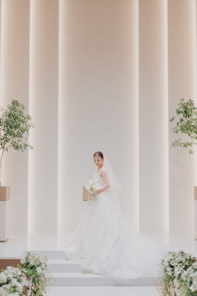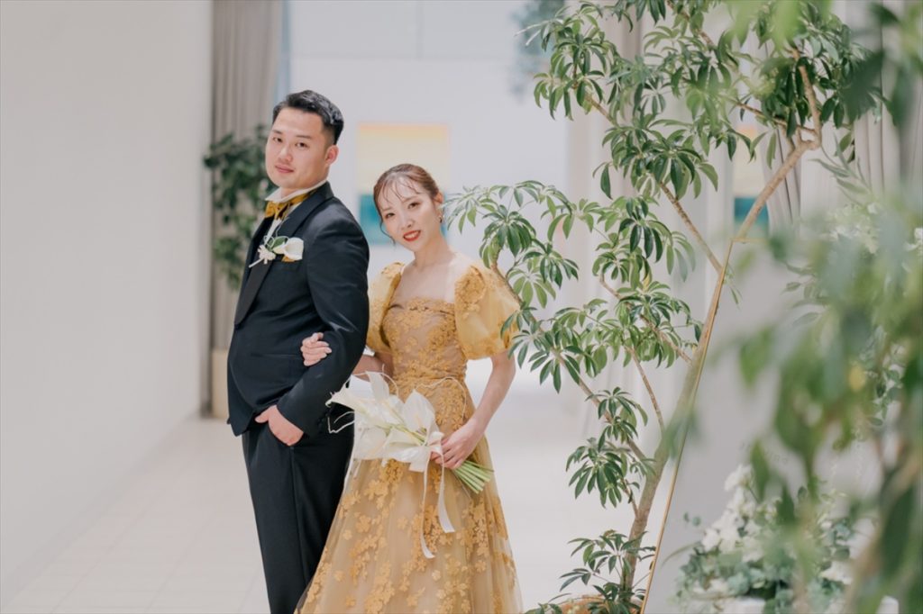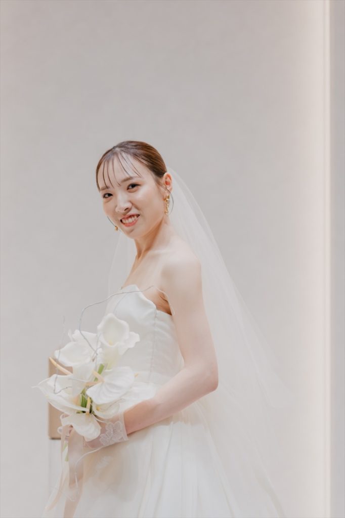 さやかさんが選ばれたドレスはB.DRESSERオリジナルブランド【meyou】のウエディングドレス。洗練された艶めきにこだわったサテンの美しさが魅力の一着です。とてもよくお似合いです!