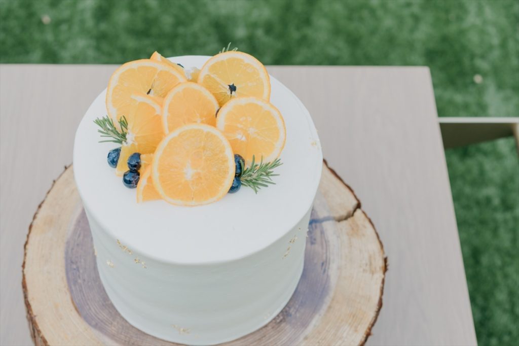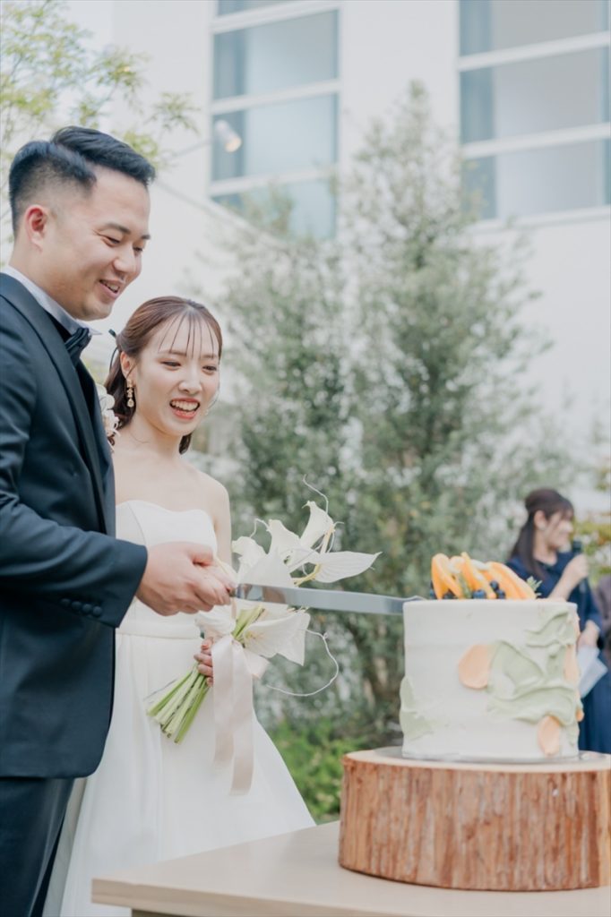 メインイベントのケーキセレモニーでは、オレンジが乗ったシンプルでおしゃれなケーキが登場。ケーキカットの前に一色ペイントをして、完成です♪おふたり仲良くケーキカットをし、愛情の分のケーキを食べさせ合います!