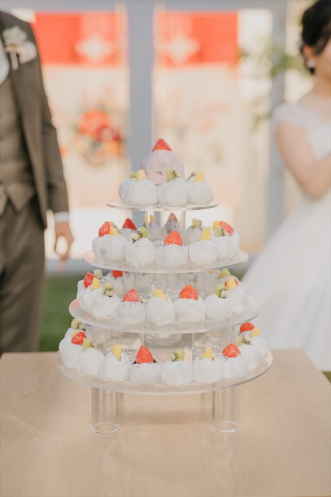 なおきさんが自ら潜って撮影したこだわりのオープニング映像を上映し、カーテンがオープンすると、おふたりがご登場です。とても素敵な海の世界観に、会場中も圧巻でした。メインイベントのケーキセレモニーでは、だいふくを用いたタワーをご用意!一番上にピンクのイチゴ大福をおふたりでのせて、完成させました♪