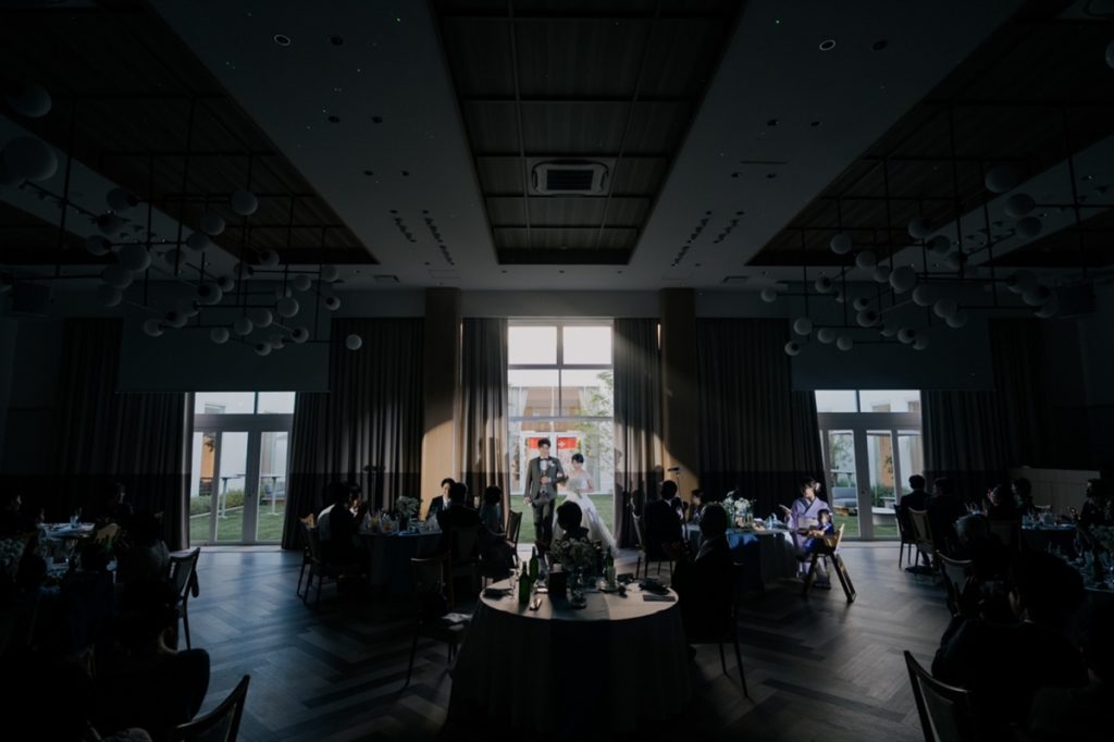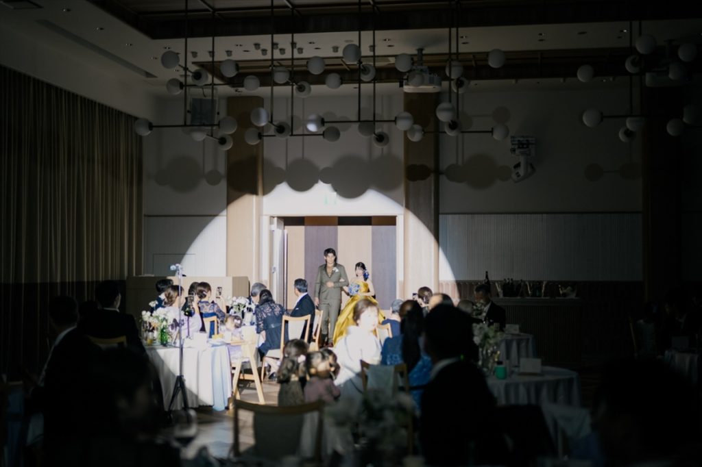 装い新たにおふたりがご登場すると、ここで「お色直しドレスの色当てクイズ」を企画し大盛り上がりのシーンとなりました♪とてもお似合いなおふたりのお姿に、ゲストの皆さまからも歓声が上がりました!