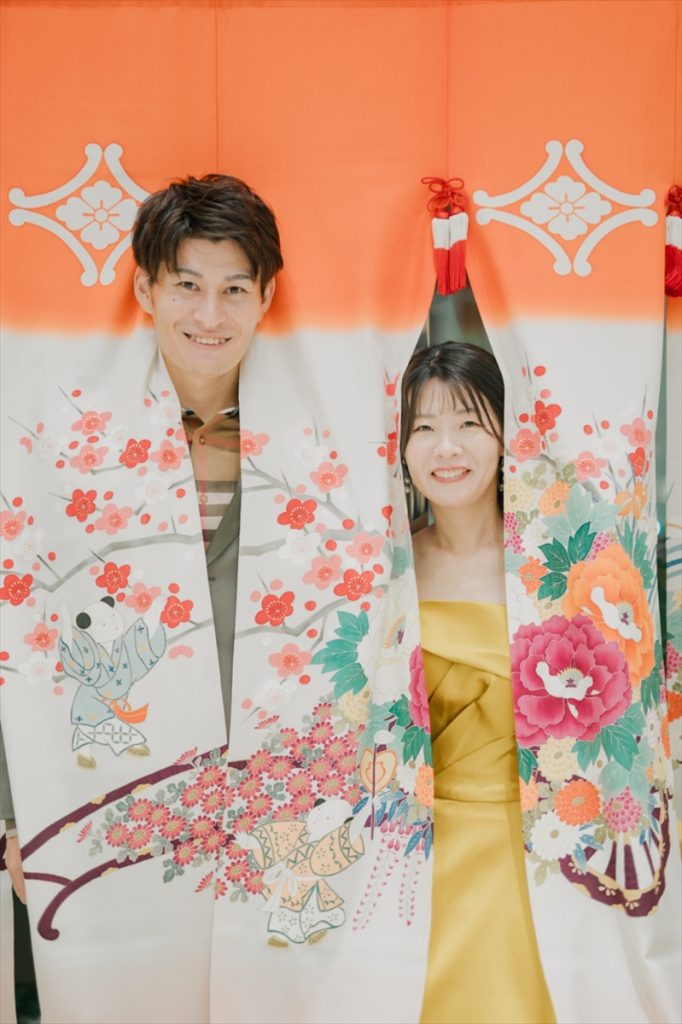 会場には嫁入り道具の一つである「花嫁のれん」を装飾にご用意されました。ゲストの皆さまが見て楽しむことができるよう配置にもこだわっていただき、大人気のフォトスポットとなっていました!