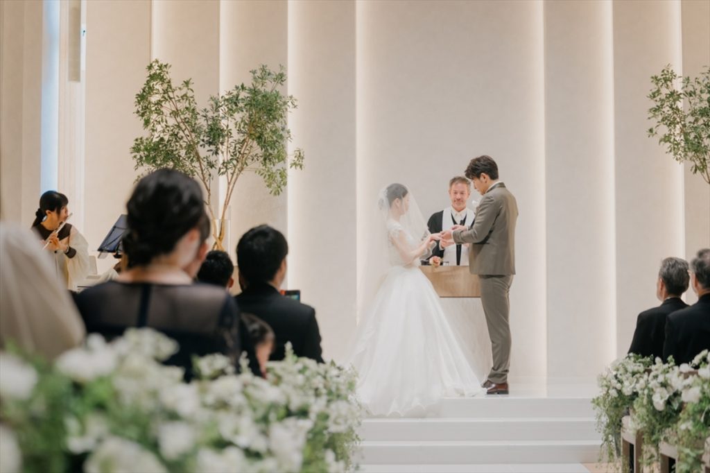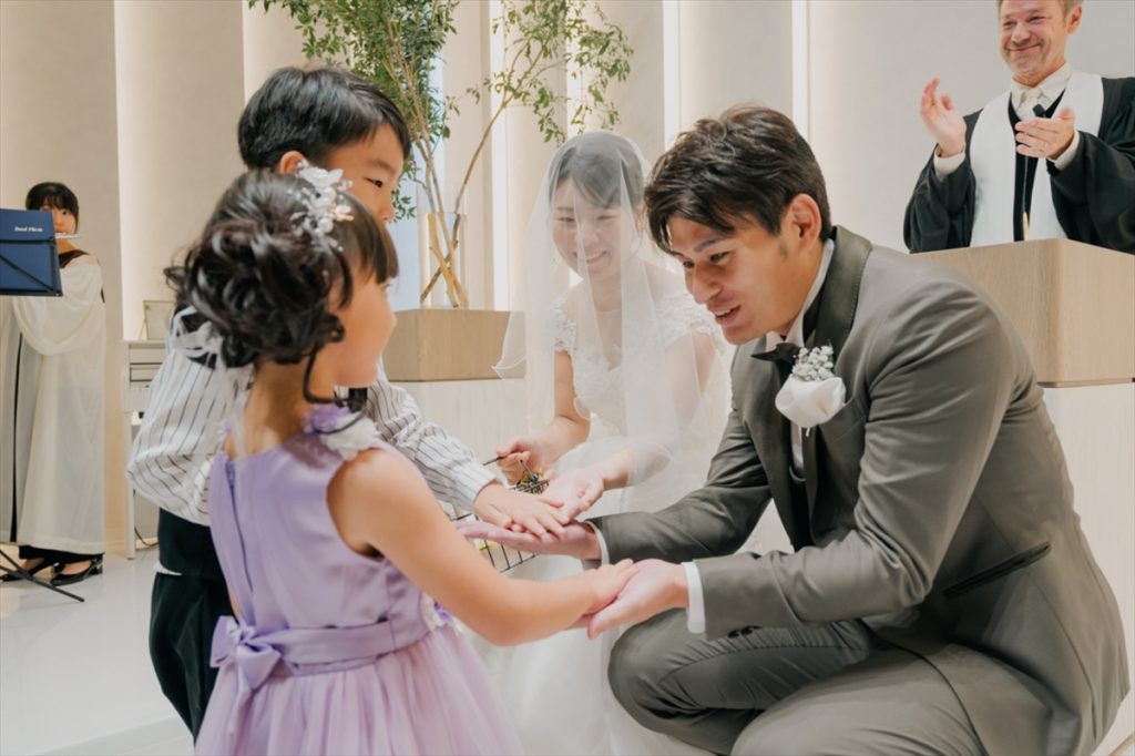 おふたりは教会式を選ばれました。なおきさんの甥っ子くん&姪っ子ちゃんがおふたりのもとへ指輪を運んでくださり、会場も和やかな雰囲気に包まれていました。